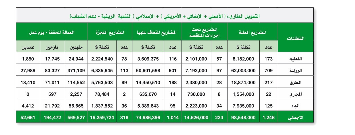 حيث نجح المشروع في تنفيذ المشروعاًت المرتبطة بالحياة اليومية للناس، مثل توفير المياه وإعادة تأهيل المدارس ورصف الطرقات وخدمات الصرف الصحي وحماية الأراضي الزراعية، وجميعها مشاريع تهدف إلى تشغيل أكبر عدد ممكن من الأيادي العاملة الماهرة وغير الماهرة خاصة في مثل هذه الأوضاع الراهنة.