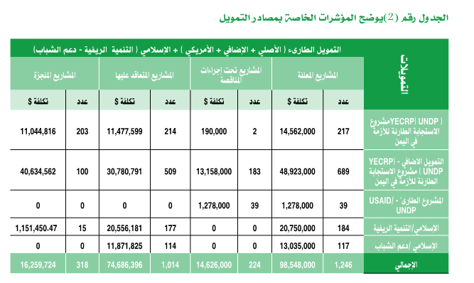 حيث تم اتخاذ كافة الإجراءات التي تم اقتراحها لتسريع عملية التنفيذ، وخاصة زيادة عدد المشاريع الفرعية، حيث تم خلال العام 2017م توقيع عقود عدد 1,014 مشروعاً بتكلفة 74,686,394 دولاراً ،منها 318 مشروعاً تم إنجازها بتكلفة 16,259,724 دولاراً وعدد 1,246 مشروعاً تم الإعلان عنها بتكلفة 98,548,00دولاراً من المقرر إنجاز معظمها خلال الربع الأول من العام 2018م، كما أن هناك عدد 224 مشروعاً تحت المناقصة بتكلفة 14,626,000 مليون دولاراً .