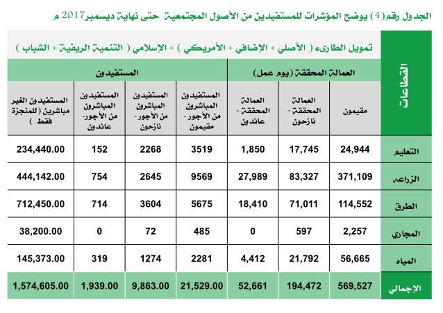 - استفاد حتى نهاية ديسمبر2017م من المشاريع المنفذة من قبل مشروع الأشغال العامة استفادة مباشرة من الأجور 52,661 شخصا .